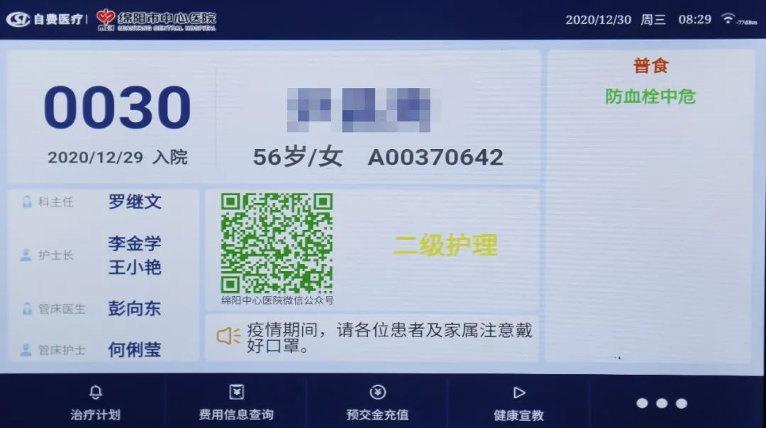 床旁的這塊屏幕作為一套連接護士站、走廊和病房的系統(tǒng),實現(xiàn)跨空間的信息互通。不僅有效提升了醫(yī)、護、患三者溝通時效,還為患者提供了更多便捷和人性化的服務。患者輸入密碼可以隨時隨地查詢費用明細,并且還可以床旁掃碼繳費,減少了患者往返排隊時間。