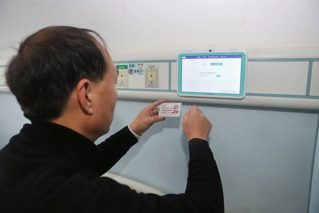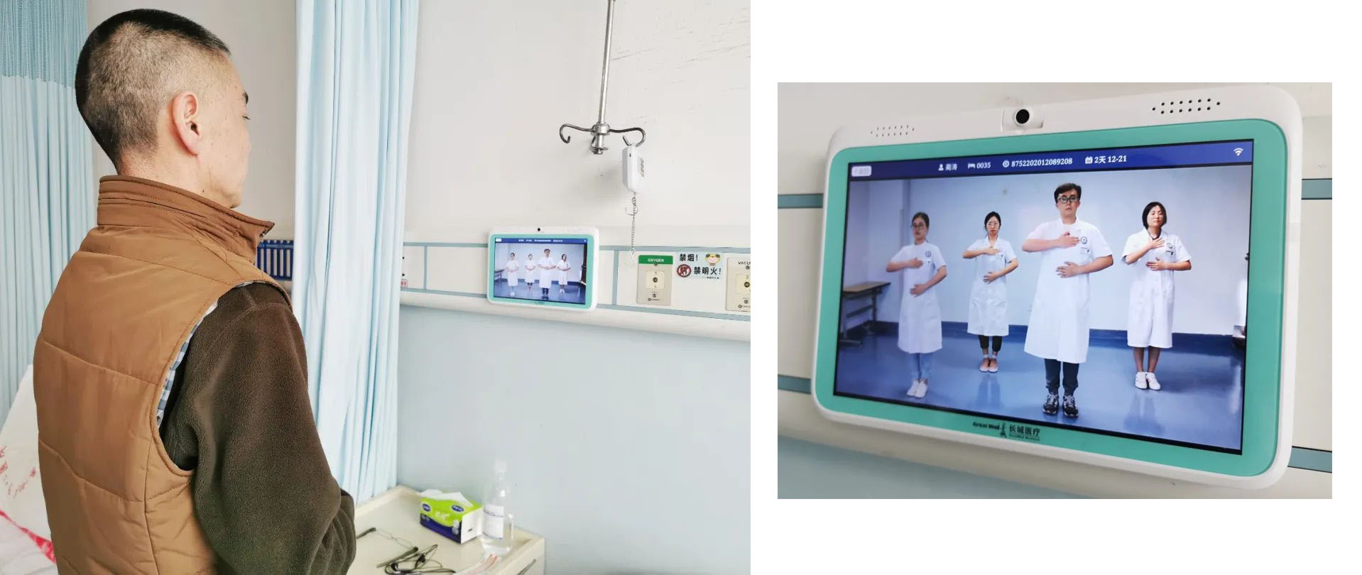 在市中心醫(yī)院心胸外科病房,剛?cè)朐旱牧质迨逭龑χ〈泊差^的電子屏幕跟著醫(yī)護人員一起做呼吸訓練操……林叔叔因肺部結(jié)節(jié)入院準備手術(shù),術(shù)前術(shù)后的呼吸訓練能幫助他快速康復,“以前我們會把患者集中組織起來教他們做呼吸訓練操,但是可能學一次就忘了,現(xiàn)在我們把這些健教視頻放在患者床頭的電子屏上,患者可隨時可以點進去跟著練習,”護士長李金學介紹,“除此之外,林叔叔還可以通過這塊屏幕實現(xiàn)診療計劃查詢、床旁掃碼繳費、費用明細查詢……以后我們還想利用這套信息系統(tǒng)完成床旁結(jié)算,患者從住院到出院,在病房就能一站式完成。”